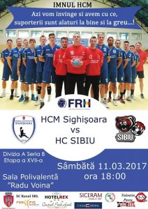 Sâmbătă suntem aşteptaţi la meci pentru a susţine echipa oraşului HCM Sighişoara în partida pe care o vor disputa de la ora 18.00 la Sala Polivalenta Radu Voina în compania echipei HC Sibiu.