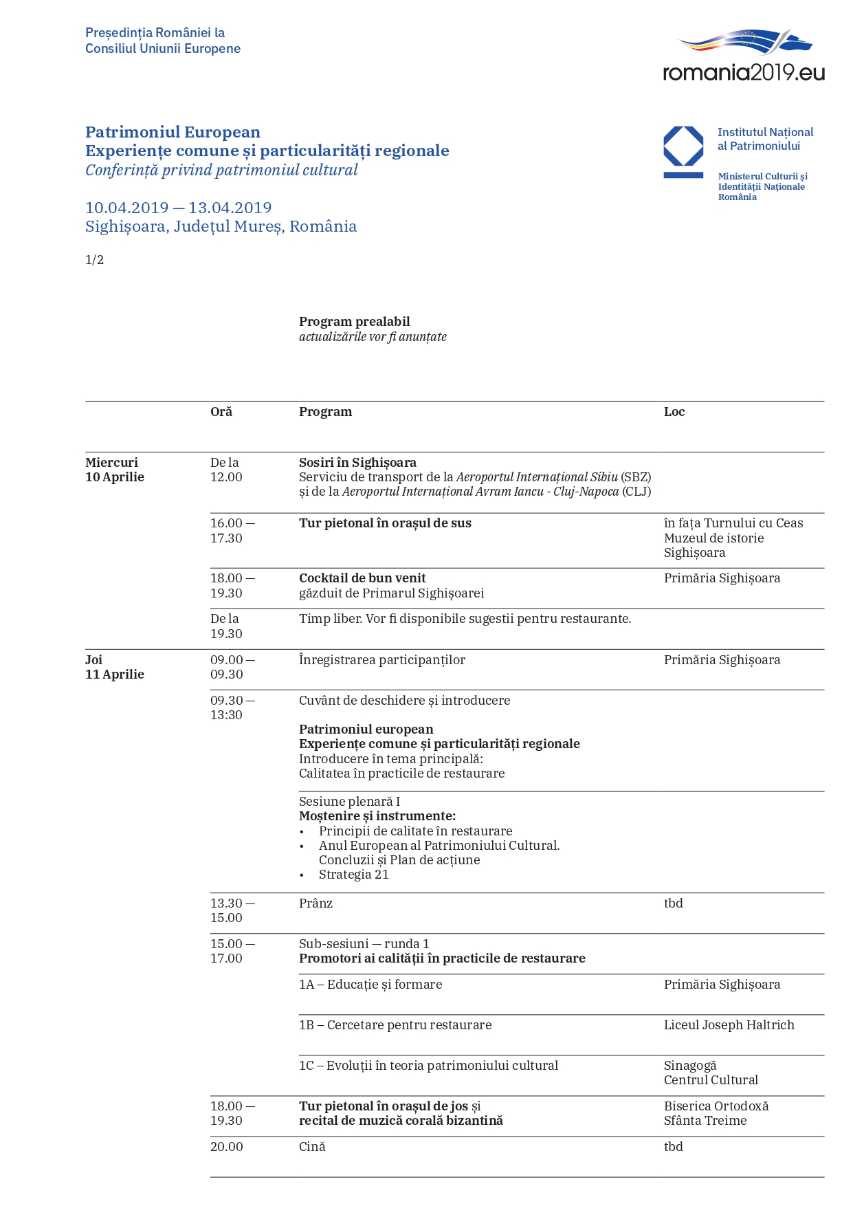 Ministerul Culturii și Identității Naționale, Institutul Naţional al Patrimoniului, cu sprijinul Municipiului Sighișoara organizează conferinţa „Patrimoniul european: experienţe comune şi particularităţi regionale”, inclusă în programul oficial al Preşedinţiei române a Consiliului Uniunii Europene. Evenimentul va avea loc la Sighişoara, între 10 şi 13 aprilie 2019.