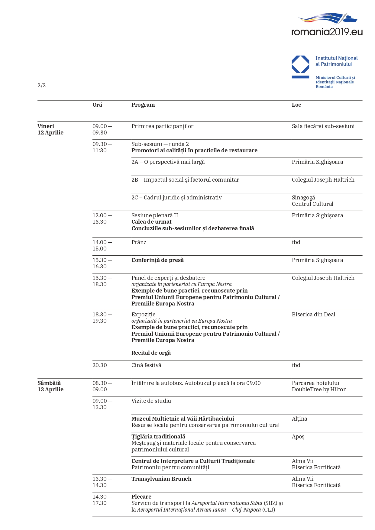 Ministerul Culturii și Identității Naționale, Institutul Naţional al Patrimoniului, cu sprijinul Municipiului Sighișoara organizează conferinţa „Patrimoniul european: experienţe comune şi particularităţi regionale”, inclusă în programul oficial al Preşedinţiei române a Consiliului Uniunii Europene. Evenimentul va avea loc la Sighişoara, între 11 şi 13 aprilie 2019.