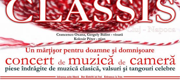 Piese clasice, tangouri si valsuri celebre, muzică de film vor fi prezentate în cadrul concertului susţinut de trupa Classis din Cluj Napoca, Cracenco Oxana şi Gergely Balint la vioară şi Kolcsar Peter la pian. Concertul, martisor muzical pentru doamne si domnisoare, face parte din seria concertelor organizate de Fundatia Cultural- Stiintifica Gaudeamus Sighisoara.