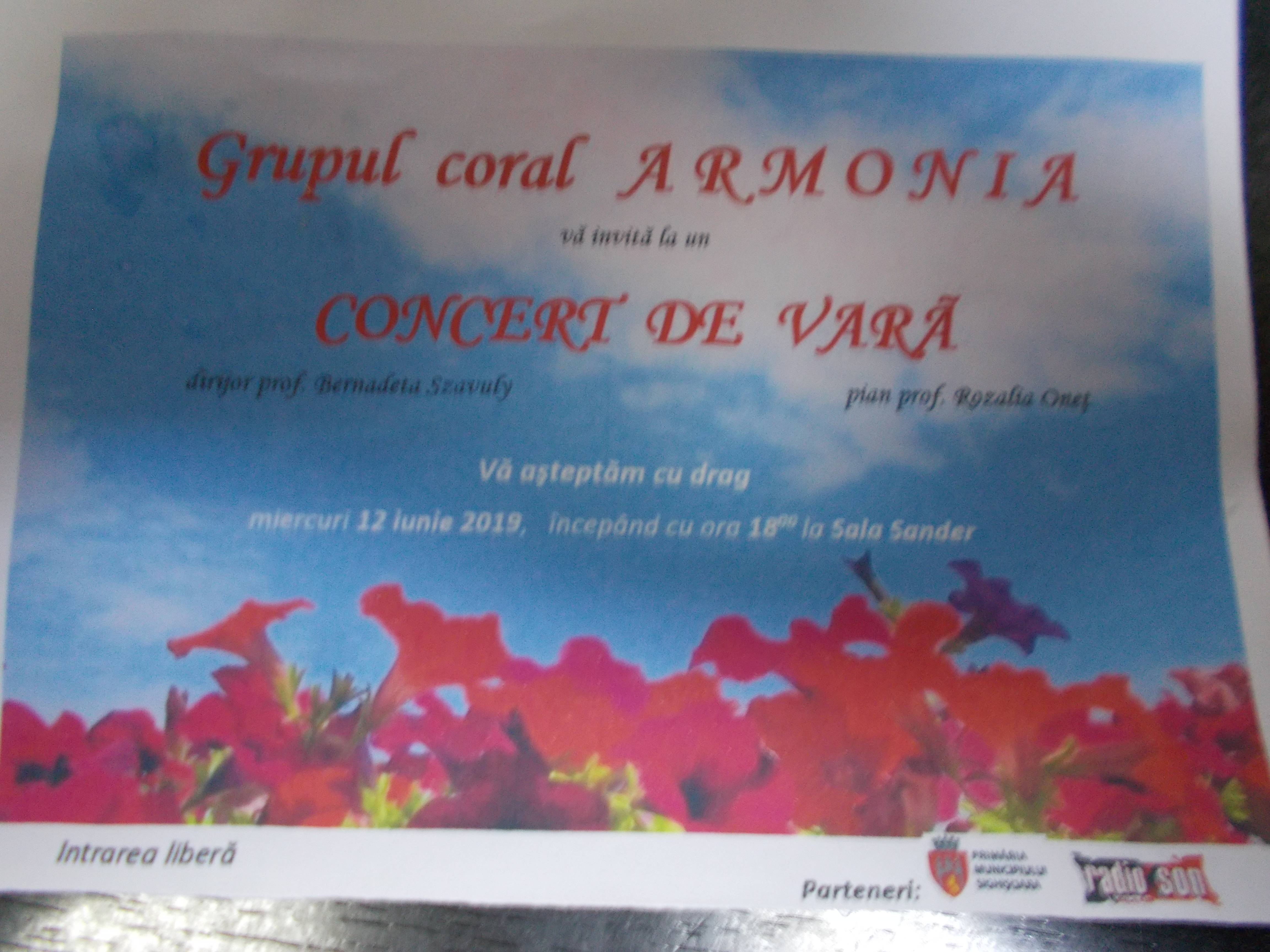 Grupul coral Armonia ne invita la un Concert de vara , miercuri 12 iunie , incepand cu ora 18 la Sala Sander. Dirijor prof. Bernadeta Szavuly, la pian prof. Rozalia Onet. Intrarea este libera.